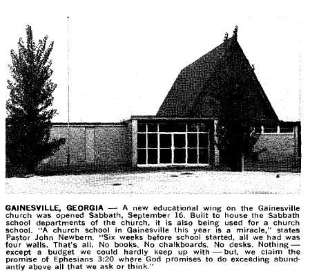 HF #8 • The Gainesville congregation actually disbanded for a short period, mainly due to the persecution they faced in the area. The present church reorganized in 1935 under the leadership of the Macon church and has been running continuously ever since.