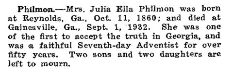HF #21 • In 1932, founding member J.E. Philmon passed away after many years of service to our church. She was the first to accept the Adventist message in Georgia and it has been estimated that she brought over 50 people to Christ before she passed away.
