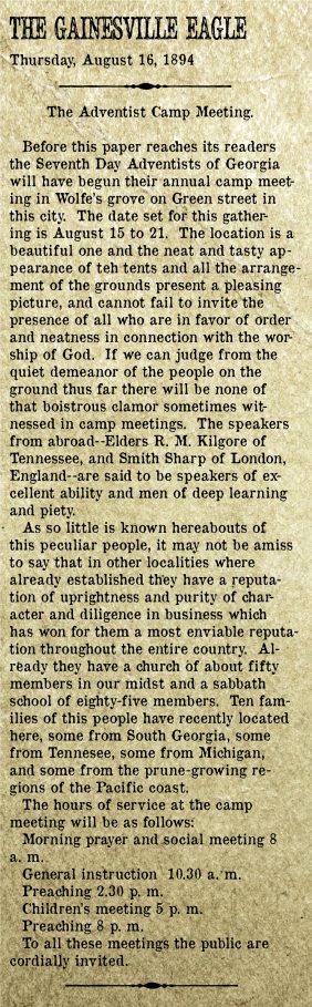 HF #23 • Remember the Georgia Camp Meeting that was held in Gainesville? Well on August 16, 1894, the Gainesville Eagle featured an article promoting this grand event. Here is a recreation of the original article.